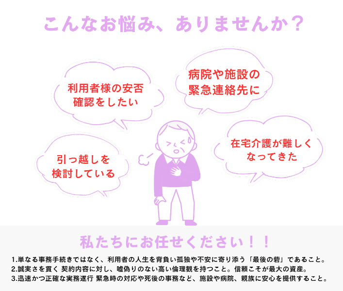 1.ご親族に代わって日常生活のお困りごとを支援・お手伝いするサービスです。(内容によって別途費用が発生することもあります。)
