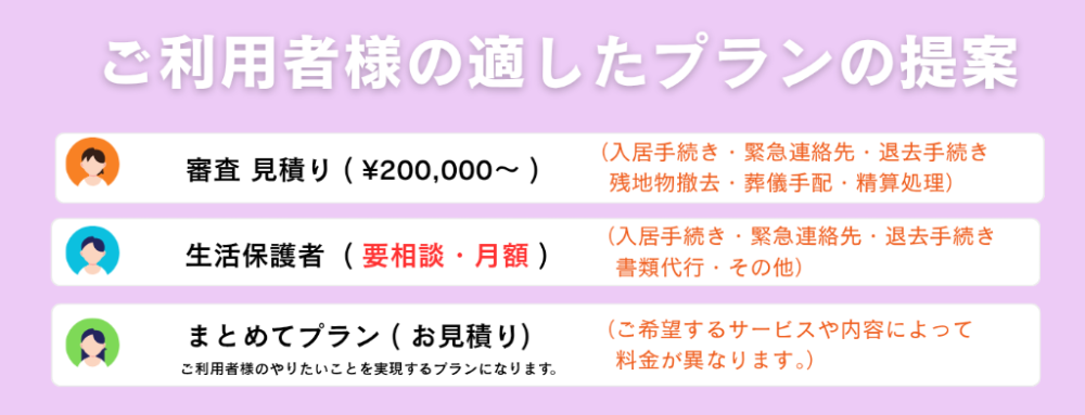 ヒアリングを重ねて、様々な理想の環境と暮らしをするための身元保証としてのお仕事と 今後やらなくてはいけないこと・やりたい ことの区別をし 理想の環境を実現する費用を計算したお見積もりを提案いたします。